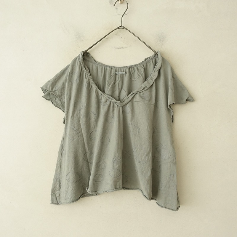 デザイン:mina perhonenのfoaming フリルカットソーです。カラーはグリーングレーで、リング状のカットジャガード柄が施された天竺ニットのような薄手素材です。襟ぐりは広めのゴム仕様で、共布フリルが施されております。プルオーバータイプで着脱でき、布端はロール仕様です。こちらは、元々の製品に工房で染め直しを施しました。一枚一枚職人の手で染められたお洋服となります。