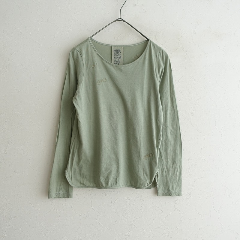 デザイン:mina perhonen laundryのchoucho 刺しゅうカットソーです。カラーはくすみグリーンで、蝶刺しゅうが施された薄手の天竺ニット地です。プルオーバータイプで着脱でき、裾はラウンドカット仕様で、襟ぐり&裾には共布パイピングが施されております。こちらは、元々の製品に工房で染め直しを施しました。一枚一枚職人の手で染められたお洋服となります。