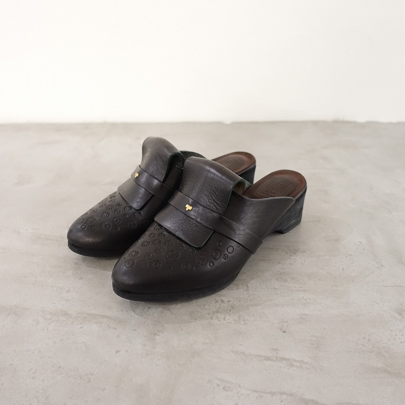デザイン:mina perhonenのpied des bois サボサンダルです。カラーはブラックで、レザー素材です。アッパーに小花の型押しが施されており、甲部分の中央にハチのモチーフがあしらわれたデザインです。インソールはブラウンで、クッション性がございます。ソールは木目調です。定価(メーカー希望小売価格)46,200円の商品です。