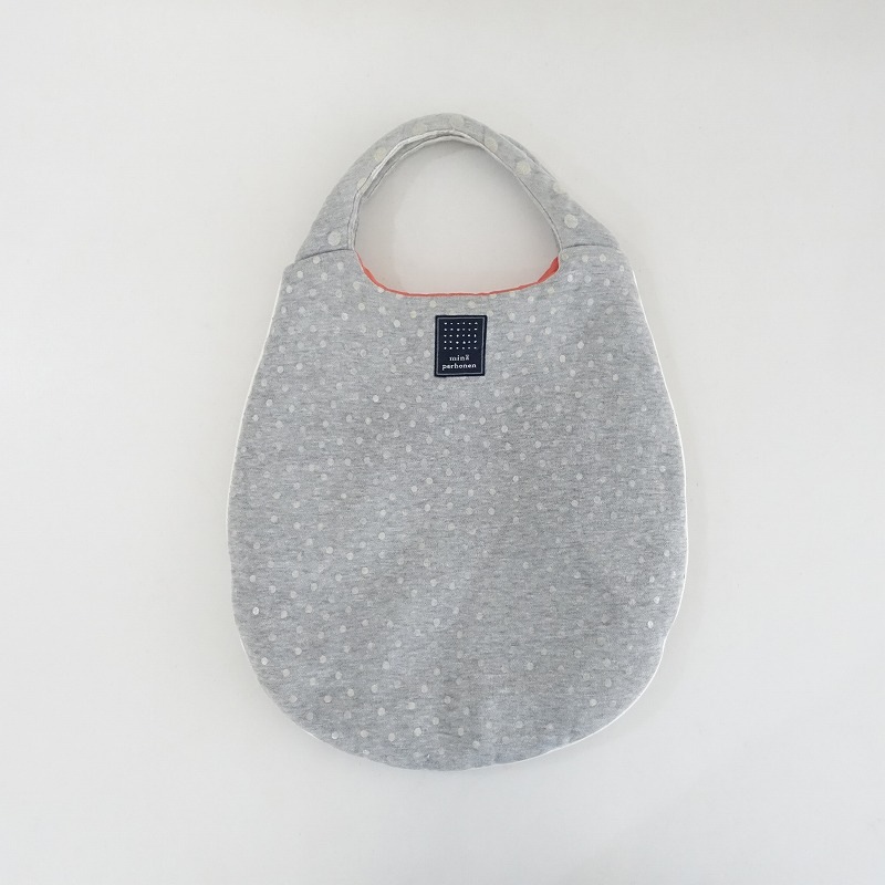 デザイン:mina perhonenのdiscoエッグバッグです。カラーはライトグレー系で、スウェット地に前後で大きさの違うドット柄の箔プリントがあしらわれており、サイド周りはパイピングが施されています。内側は光沢のある濃サーモンピンクの裏地付きで、素材は表地が綿100%、裏地がポリエステル100%、パイピング部分が人工皮革です。