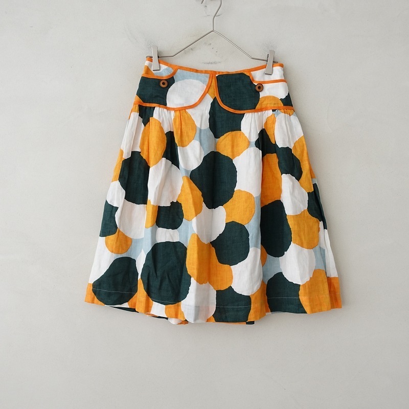 デザイン:mina perhonenの10000 feet プリントリネンスカートです。カラーはオレンジ、グリーン、ホワイトなどで、10000 feetテキスタイルプリントの施された薄手のリネン地で仕立てられ、裏地付きです。左サイドファスナー付き、両サイドに小さなポケット付きです。