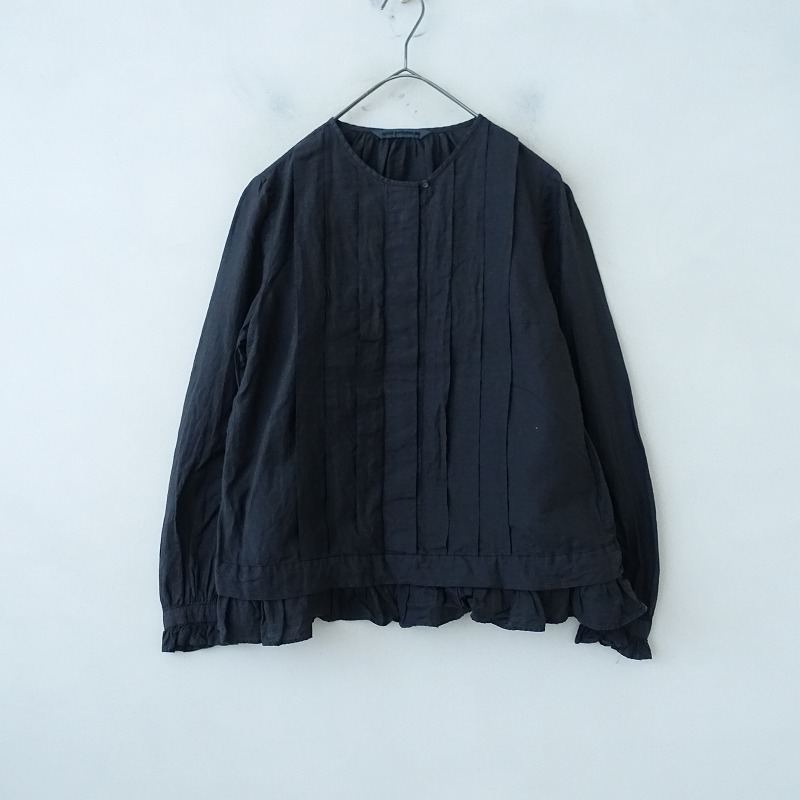 デザイン:mina perhonenのsokeri フリルプリーツブラウスです。カラーはチャコールで、薄手の素材です。裾&袖口に共布フリル付きで、フロントにタックプリーツ、バックネック&袖口にギャザーが施されております。首元ループボタン&フロント半開比翼ボタン付きのプルオーバータイプで着脱でき、袖口はボタン留めです。こちらは、元々の製品に工房で染め直しを施しました。一枚一枚職人の手で染められたお洋服となります。