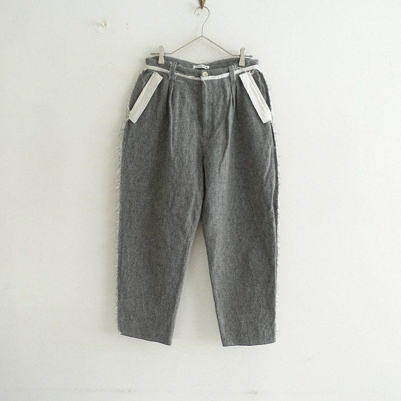 デザイン:mina perhonenのsnowy day タックパンツです。カラーはミックスグレー・オフホワイトで、裏打ちのある綿毛など混紡の起毛素材です。前腰にタック入りのテーパードデザインで、布端は裁ち切り、裾はロック仕上げです。フロントのボタン・内ボタン&ジッパーで着脱でき、前腰左右&ヒップ左右にポケットがあり、フラップはフェイクです。