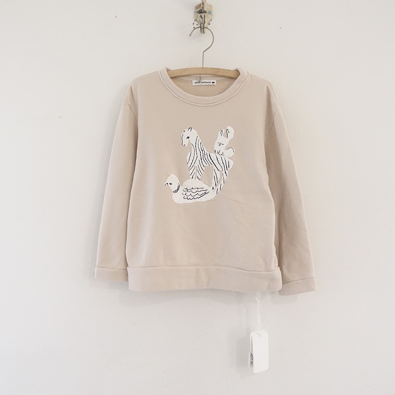 デザイン:mina perhonenのlife puzzle プリントプルオーバーです。カラーはライトベージュで、裏面パイルのスウェット地で仕立てられております。動物たちのプリント入り、子供用アイテムです。定価(メーカー希望小売価格)13,200円 税込みの商品です。