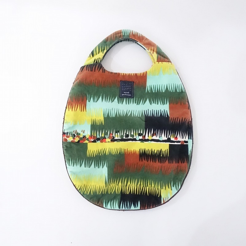 デザイン:mina perhonenのfringeエッグバッグです。カラーはグリーン×イエロー×ブラウン等のテキスタイル柄で、サイド周りはブラウンの合皮でパイピングが施されており、内側はオレンジブラウンの光沢のある裏地が付いております。 素材は表生地が麻100%、裏生地がポリエステル100%です。