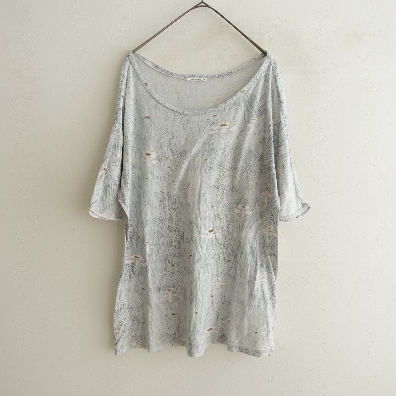 デザイン:mina perhonenの「day break」プリントカットソープルオーバーです。カラーはアイスブルー地×金ラメ・白・薄紺などです。柔らかくふわりと軽やかな、コットンの甘いジャージ素材です。透け感がございます。大きく開いたネックライン、ドルマンスリーブの半袖プルオーバーです。ポケットはございません。