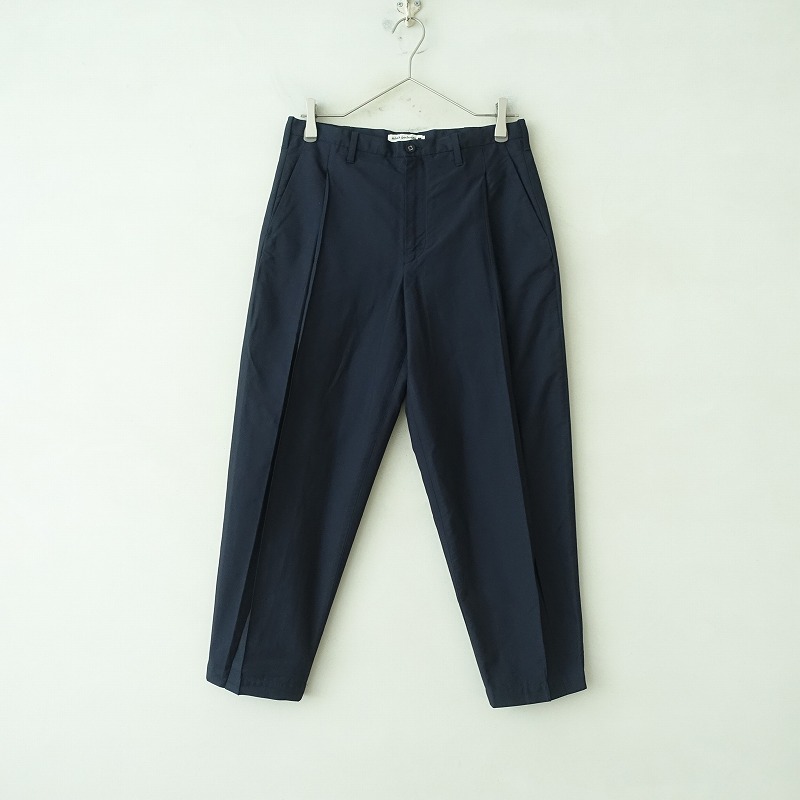 カラーなど:mina perhonenのvalo タックテーパードパンツです。カラーはネイビーで、やや張りのあるポリエステル地で仕立てられております。フロントセンターにピンタック入り、裾サイドにタック入りのテーパードシルエットになっております。フロント開口部はボタン&ファスナー仕様、ポケットは4つ付きです。