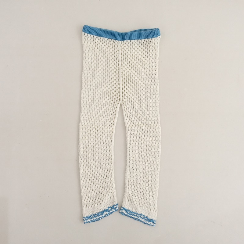 デザイン:mina perhonenのrain chukka ニットレギンスです。カラーはホワイト×ライトブルーで、透け感のある鍵編みのようなニット素材で仕立てられており、裾は小さなフリルのようになっております。ウエストは総ゴムで、子供用アイテムです。