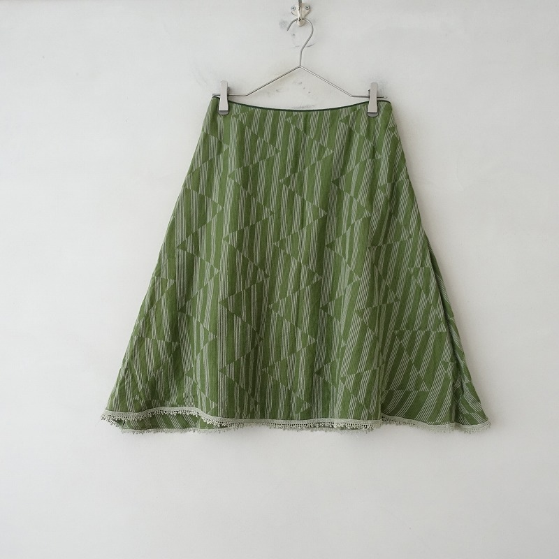 カラーなど:mina perhonenの「crests」ガーゼフレアスカートです。カラーはライトグリーン×ホワイトです。先染めストライプと幾何学柄が施されたコットンガーゼ二重織り生地を使用。サラッとしたコットン薄手生地の裏地付きです。左のジッパー開きで、ウエストにはロープコードのパイピング、裾には小さな花を配したレースブロードがあしらわれております。ポケットはございません。