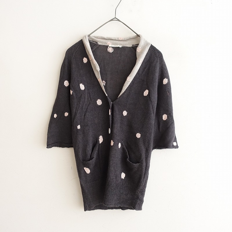 カラーなど:mina perhonenのsunny snow リネンブレンドハーフスリーブニットカーディガンです。カラーはチャコールグレー×ライトグレーの配色切替で、ピンクのドット編みの薄手ニット素材です。フロントボタン開閉で着脱でき、両腰にポケット付きです。