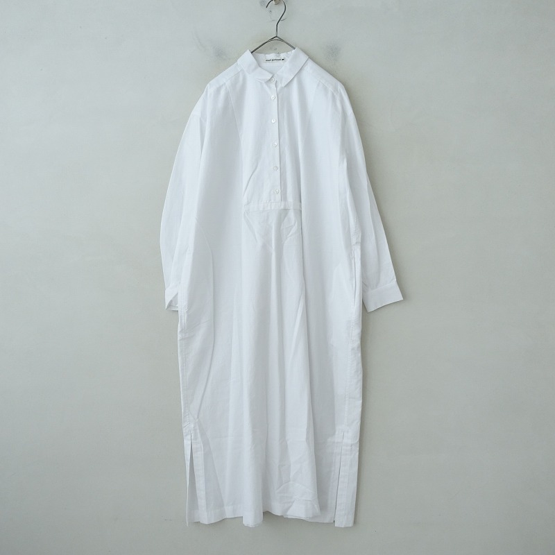 カラーなど:mina perhonenのbrisk コットンシャツワンピースです。カラーはホワイトで、コットンの布帛地で仕立てられています。ハーフボタン付きのプルオーバータイプで、裾サイドにスリット入り、両サイドにシームポケット付きです。