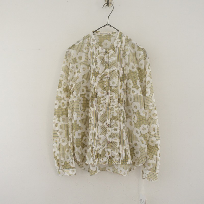 カラーなど:mina perhonenのflower dance コットンプリントシフォンフリルブラウスです。カラーはホワイト・イエロー・ピンク・ライトグリーンで、総柄プリントのシフォン地で仕立てられております。バンドカラーデザインで、フロントにピンタック、前立てには共布フリルがあしらわれており、フロントボタン開閉で着脱できます。定価(メーカー希望小売価格)47,300円 税込みの商品です。