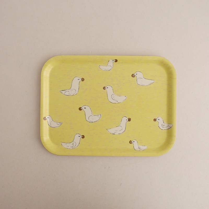 カラーは淡く優しい色合いのイエローベースにホワイト・ブラウンなどで、サブレをついばんでいる水鳥たちが描かれています。