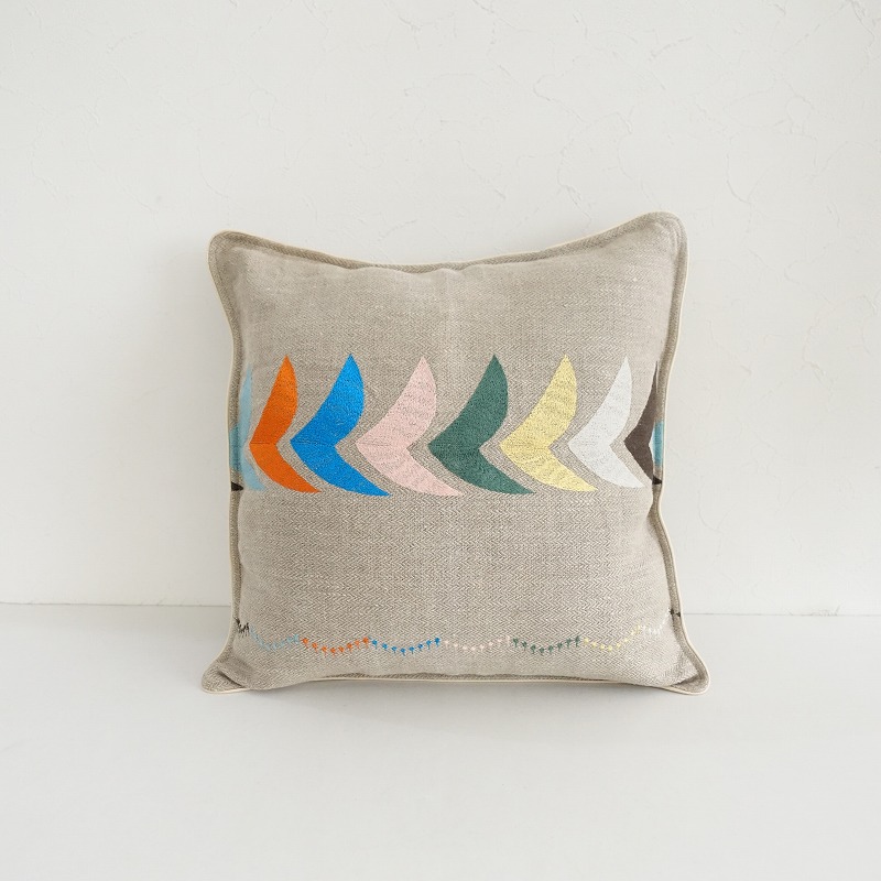 カラーなど:mina perhonenのbird クッションカバーです。カラーはナチュラルベージュのヘリボーン生地にライトブルー・オレンジ・グリーンなどでテキスタイル刺しゅうがあしらわれており、開口部はボタン開閉です。素材は表生地がリネン100%、刺しゅう部分が綿63%,レーヨン37%です。