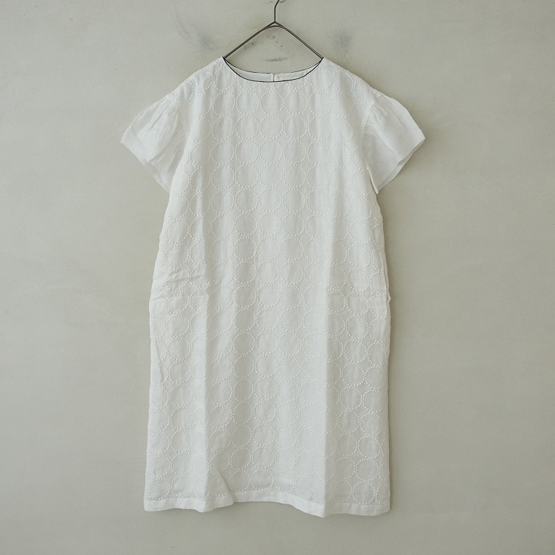 カラーなど:mina perhonenのtambourine 刺しゅうワンピースです。カラーはホワイトで、身頃のみ刺しゅうが施された透け感ある薄手の麻素材です。襟ぐりにはブラックのコードパイピング付きで、バックネックにループボタン&ドロップホール付きのプルオーバータイプで着脱できます。袖はギャザー入りのフレアデザインで、袖口はピコカット仕様です。腰両サイドにシームポケットがあり、袖以外に裏地付きです。定価(メーカー希望小売価格)71,500円の商品です。