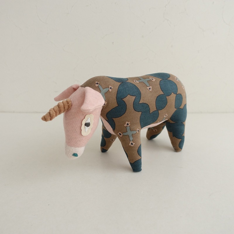 「snow diamond」 交差点を行き交う人々のように、それぞれの想いを乗せているかのように、それぞれの形を風に任せてゆらゆらと舞う雪。 不揃いのドットのゆらぎがダイヤ柄を描く、そんな繊細なテキスタイルが使用されています。 どこかあどけなさの感じられるやさしい表情のユニコーンは、グレーブラウンのボディにライトピンクのお顔です。 柔らかな肌触りのコットン100%生地が使用され、刺繍で施された目やしっぽなど、手作りのあたたかみが感じられます。 何気ない日常の中にいつも変わらない穏やかな表情でそこにいてくれるような安心感の感じられるお品物です。お腹を押すと音が鳴ります。