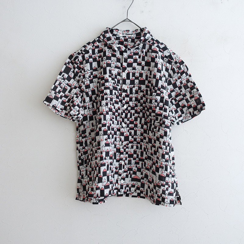 カラーなど:mina perhonenのhutte リネン半袖プリントシャツです。カラーはホワイト、ブラック、朱色で、hutteのテキスタイルプリントがあしらわれた薄手のリネン地で仕立てられています。ボタン開閉で、左胸にポケット付きです。