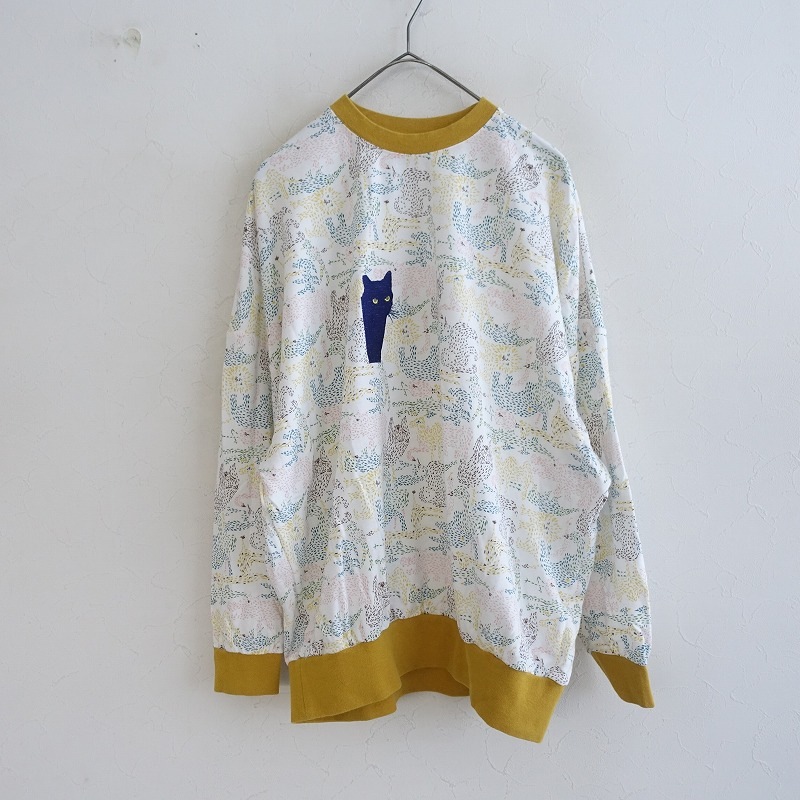 カラーなど:mina spolonenのtransceiver animal プルオーバーです。カラーはホワイトベースに、カラフルな動物たちのプリントがあしらわれており、マスタード系のリブが使用されております。ネイビーブルーで猫の刺繍があしらわれており、定価(メーカー希望小売価格)38,500円 税込みの商品です。