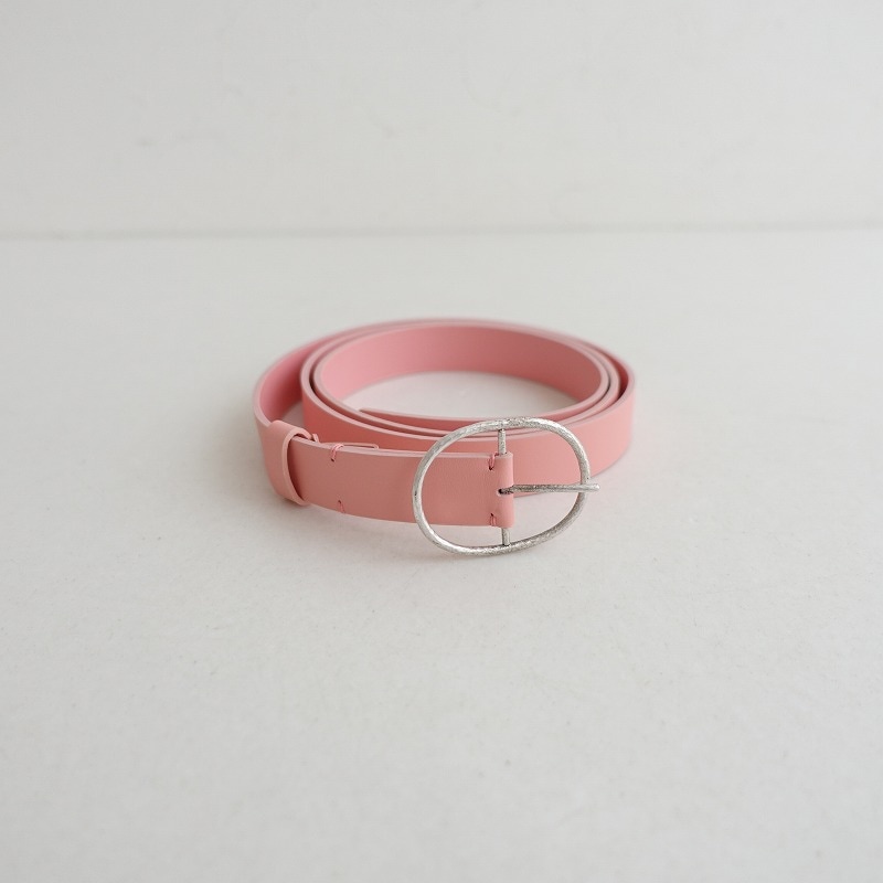カラーなど:mina perhonenのoval レザーベルト です。カラーはピンクでたまごのような楕円形のバックルのついたベルトです。真鍮を彫ったバックルは、表情をあえて残しクラフト感のある仕上がりになっております。
