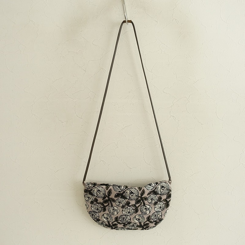 「rosy」のテキスタイルが施されたデザインで、ハンドルは合皮ひもで仕立てられ、開口部は小鳥の引手のファスナー仕様になっております。