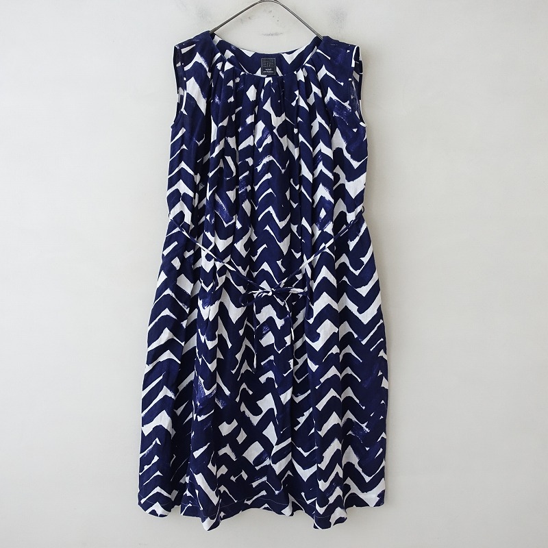 カラーなど:mina perhonenの「yamanami」ノースリーブワンピースです。カラーは白地×ネイビーの手書き風テキスタイル「yamanami」のプリントです。清涼感・少し透け感のある麻生地を使用。プルオーバー仕様のワンピースです。パイピングを配し、タックプリーツが寄せられたラウンドネック。ゆったりとした身幅にウエストはベルトループ&着脱可能の腰紐があしらわれております。両サイドにシームポケットがございます。定価(メーカー希望小売価格)72,600円の商品です。