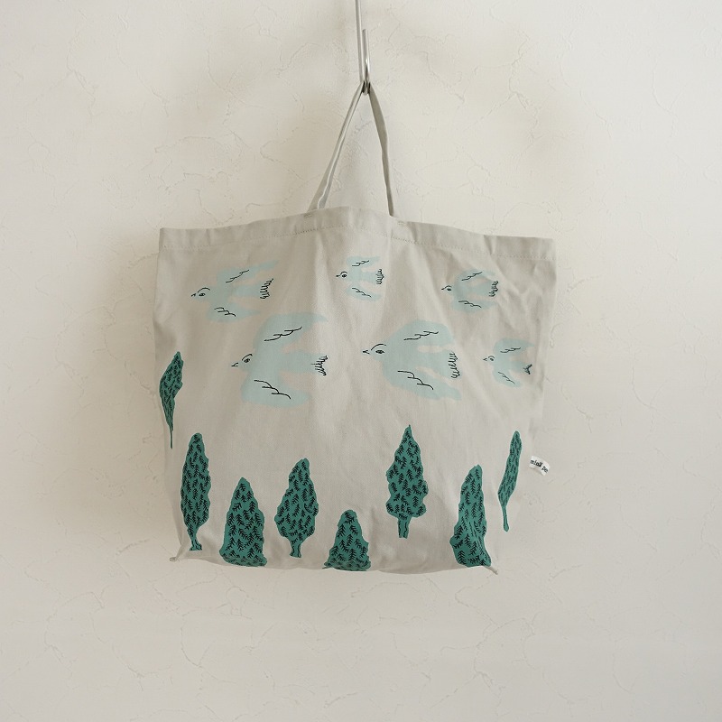 カラーなど:mina perhonenのUccelli+Boschi トートバッグです。カラーはライトグレーのコットン100%素材に、ブルーグレー・グリーン・ブラックで鳥たちのプリントがあしらわれております。定価(メーカー希望小売価格)8,800円のお品物です。