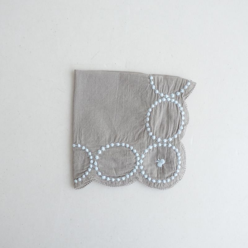 カラーなど:mina perhonenのtambourine ハンカチです。カラーはグレージュベースにライトブルーでテキスタイル刺しゅうとチョウチョのワンポイント刺しゅうがあしらわれています。