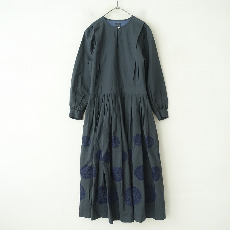 カラーなど:mina perhonenのforest dot コットン刺繍ドレスワンピースです。カラーはチャコールグレーで綿絹混紡の薄手地に、ネイビーでお花のような刺繍があしらわれており、裏地が付いております。ウエスト切替下はタック入りでふんわりとしたスカートシルエットになっており、フロント襟元のボタン開閉のプルオーバータイプです。両サイドにシームポケットが付いております。