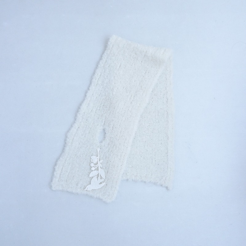 カラーなど:2024年AWコレクション、mina perhonenのmuschio マフラーです。カラーはオフホワイト(表記はホワイト)で、アルパカ89%,ナイロン11%のニット素材にforest paradeの刺しゅうモチーフがあしらわれており、穴を通して首に巻くタイプのマフラーです。定価(メーカー希望小売価格)13,200円の商品です。