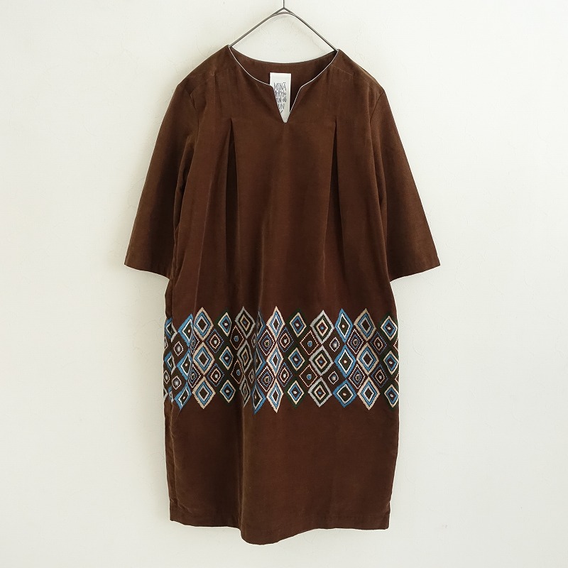 カラーなど:mina perhonen laundryのflower daiamond 刺しゅうワンピースです。カラーはブラウンにライトブルー・グレー・ダークグリーン・ベージュの刺しゅう入りで、細かな格子柄のコーデュロイのような微起毛パイル素材です。襟ぐりにはコードパイピング付きで、両胸&背上部にタック入りです。キーネックのプルオーバータイプで着脱でき、腰両サイドにシームポケットがあり、裏地は付いておりません。定価(メーカー希望小売価格)49,500円の商品です。
