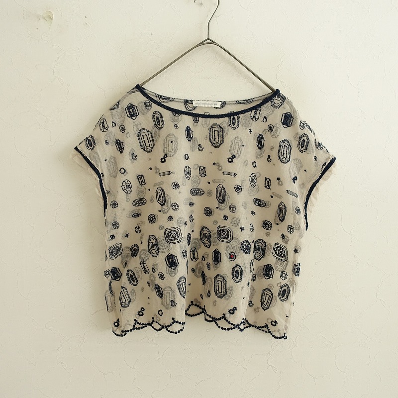 カラーなど:mina perhonenのgomma 刺しゅうチュールプルオーバーです。カラーはライトベージュにダークネイビーの刺しゅう&カットワーク刺しゅう入りで、柔らかなチュールレース地です。袖口に共布の裁ち切りフリル付きで、裾はスカラップ仕様です。プルオーバータイプで着脱でき、前腰左にレッドのストーン付きです。定価(メーカー希望小売価格)41,800円の商品です。