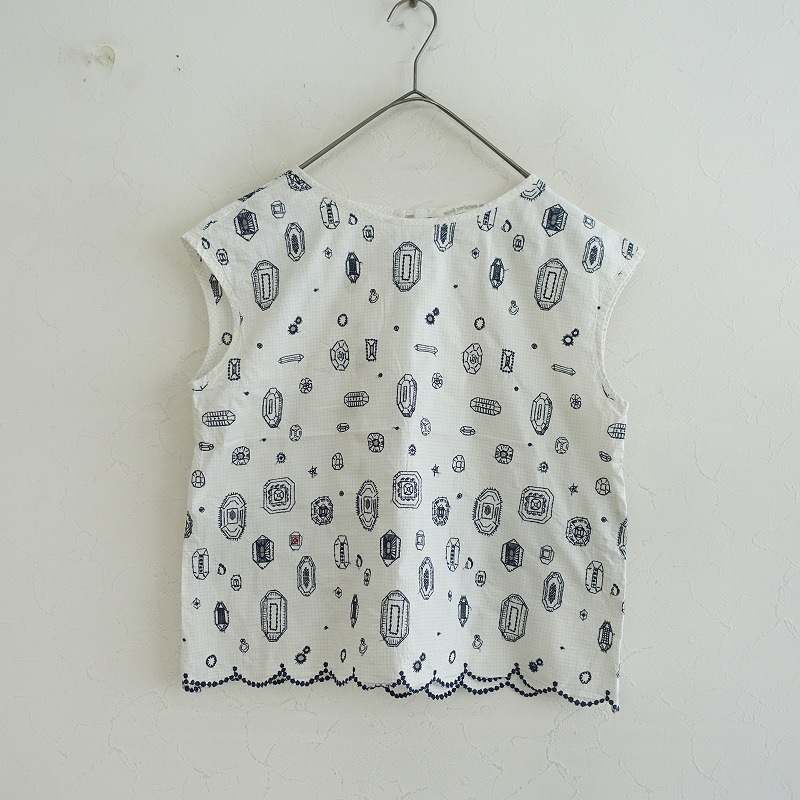 カラーなど:mina perhonenのgemma 刺しゅうノースリーブブラウスです。カラーはオフホワイトで、細かな格子チェックにgemmaのネイビーのテキスタイル刺しゅうがあしらわれたコットンシルクの薄手生地で仕立てられています。背上部に1つボタン付きのプルオーバータイプで、裾はスカラップラインです。1粒の赤いラインストーンがアクセントです。
