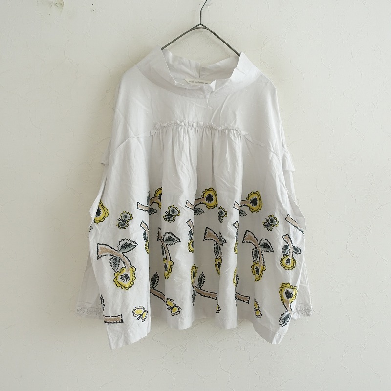 カラーなど:mina perhonenのyume ロールカラー刺繍ブラウスです。カラーはライトグレーで光沢のあるドット刺繍入り地ベースに、チャコールグレー・イエロー・ライトベージュ等でお花の刺繍があしらわれております。ロールカラーデザインで、ピコカットの共布フリルがあしらわれており、身幅の広いシルエットになっております。定価(メーカー希望小売価格)49,500円 税込みの商品です。