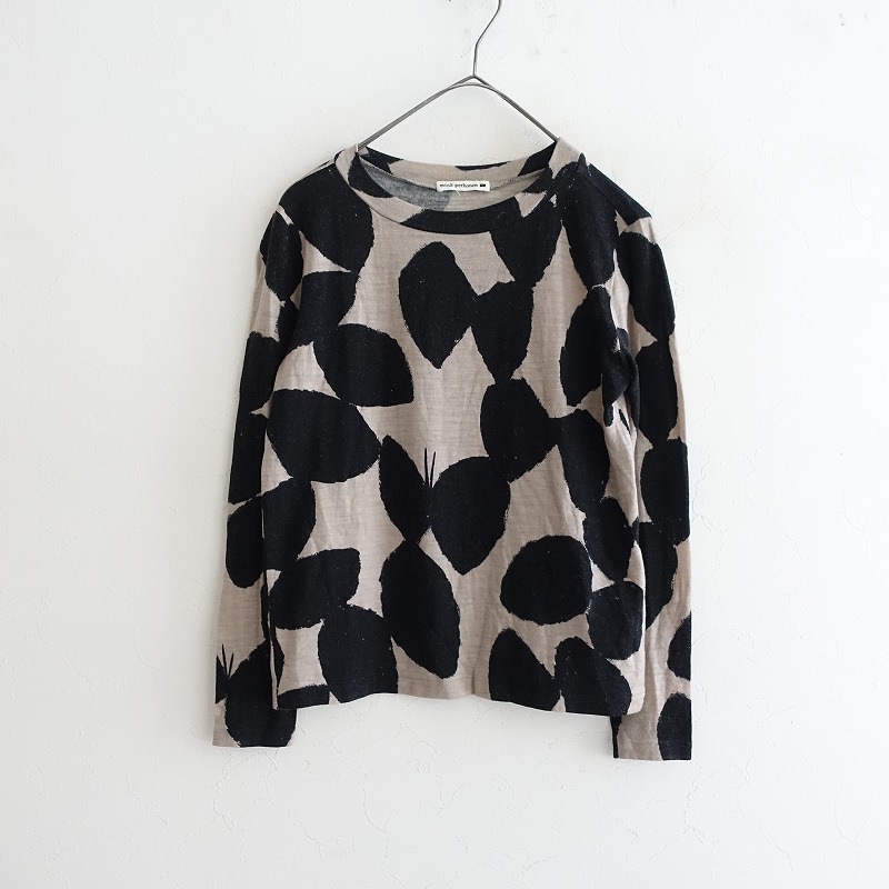 カラーなど:mina perhonenのslow dance プリントカットソーです。カラーはブラック・グレーベージュの総柄プリント(ブランド表記カラーはブラック)です。薄手ウールのニット地で、プルオーバータイプで着脱できます。定価(メーカー希望小売価格)26,400円の商品です。