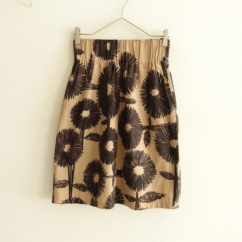 カラーなど:mina perhonenのdaisy プリントスカートです。カラーはベージュにダークブラウンの花柄プリントで、キュプラ×綿混紡の布帛地です。ウエストは幅広の平ゴム仕様で、腰両サイドにシームポケットがあり、裏地付きです。