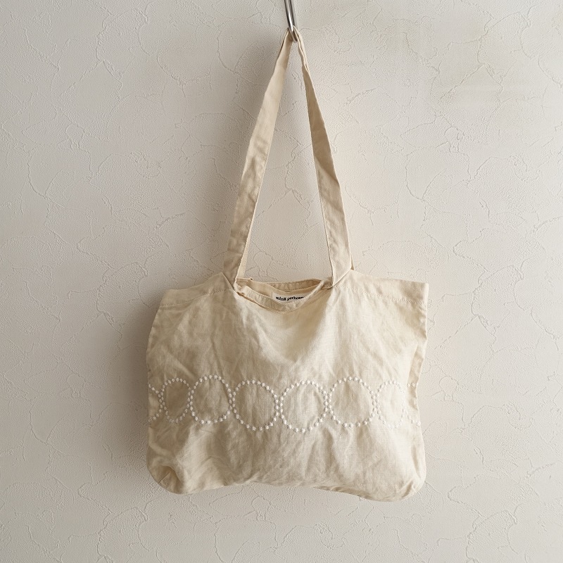 カラーなど:mina perhonenのtambourine 2WAYトートです。カラーはベージュで、白の色糸で「tambourine」のテキスタイル刺しゅうが施されたデザインです。開口はオープンで、内側にオープンポケットが1個、素材は表生地:綿100%、刺しゅう部分:綿100%です。手提げ・ショルダーと2WAYにてご使用いただけます。