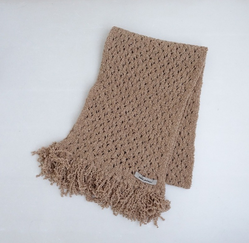 カラーなど:mina perhonenのニットマフラーです。カラーは濃ベージュで、もこもこした透かし編みのニット素材であしらわれており、両サイドフリンジ仕様です。