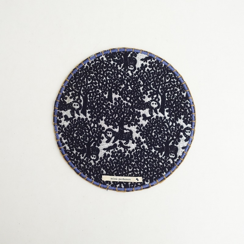 カラーなど:mina perhonenのmoon bear ファブリックマットです。カラーは、ダークネイビーとシルバーで、moon bearのテキスタイルがあしらわれている、まん丸なマットです。回りにはパープルで刺しゅうが施され、ベージュの糸でステッチがされております。