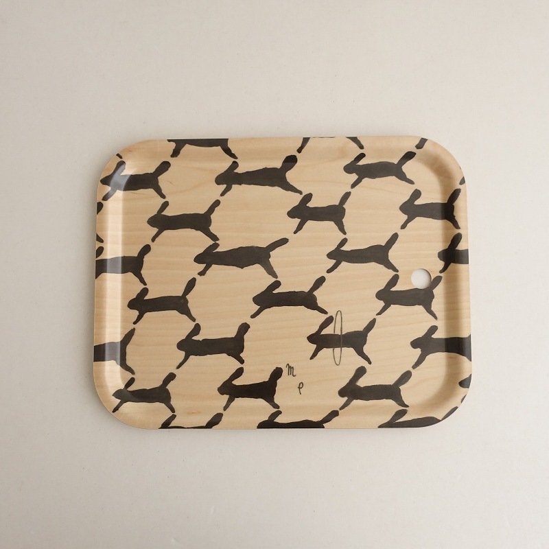 カラーなど:mina perhonenのトレイ 大 run run runです。カラーはライトベージュに黒で「run run run」のテキスタイルがプリントされており、サイドに小さな穴が開いたトレイです。 天然木で作られております。お家のティータイムを楽しくしてくれるお品物で、インテリアとして壁掛けにしていただいても素敵です。