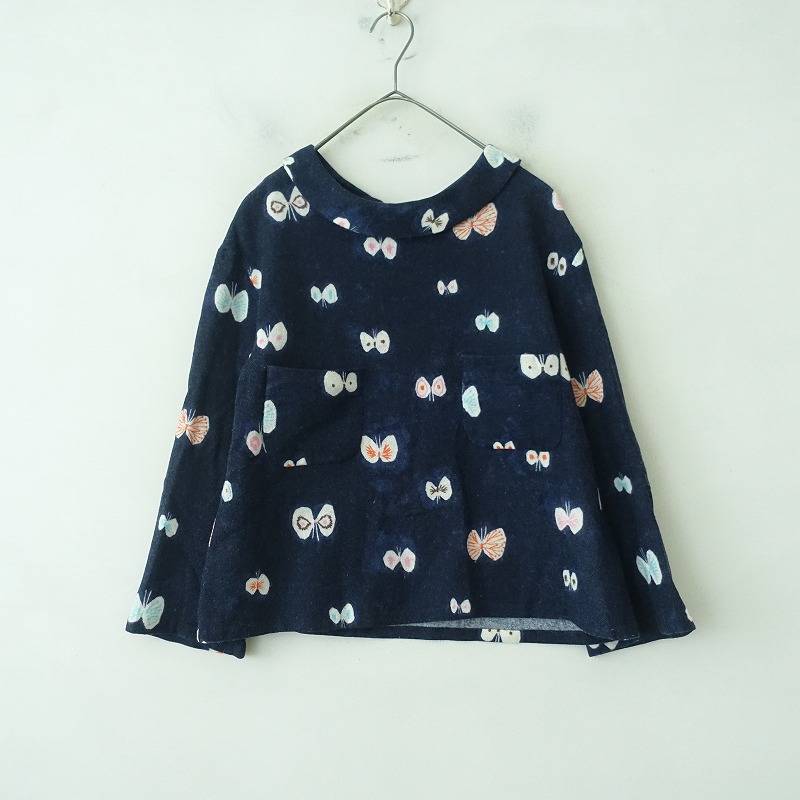 カラーなど:mina perhonenのhana hane カシミヤプリントブラウスです。カラーはムラのあるネイビーにオフホワイト・ピンク・オレンジ・ライトブルー・ブラウンのプリントで、柔らかな薄手の起毛カシミヤ素材です。後ろネックにループボタン&ドロップホール付きのプルオーバータイプで着脱でき、両胸にパッチポケットがございます。定価(メーカー希望小売価格)39,900円の商品です。