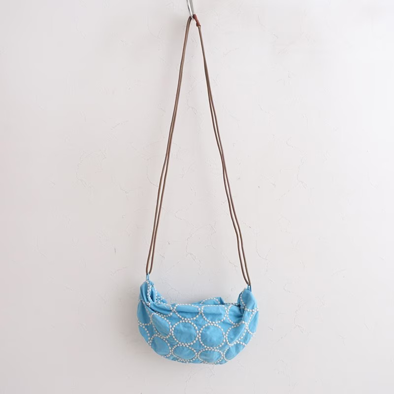 カラーなど:mina perhonenのtambourine coupe bagです。カラーはカラーライトブルーで白の色糸で「tambourine」のテキスタイル刺しゅうが施されたデザインです。ハンドルは合皮ひもで、開口部は小鳥の引手のファスナー仕様になっております。