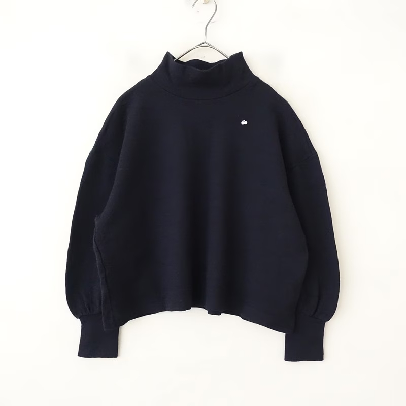 カラーなど:mina perhonenのyukioto ウールハイネックプルオーバーです。カラーはネイビーで、密に編みこまれたややライトなニット生地で仕立てられております。ややワイドなシルエットになっており、ホワイトのチョウチョのワンポイント刺繍入りです。定価(メーカー希望小売価格)30,800円 税込みの商品です。