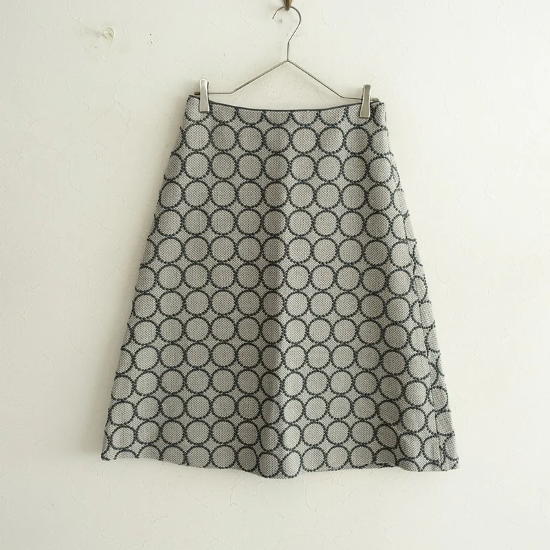 カラーなど:mina perhonenのtambourine 刺しゅうスカートです。カラーはミックスライトグレーにチャコールグレーの刺しゅう入りで、凹凸のある微起毛ウール素材です。ウエスト周りに別布のコードパイピング付きで、左腰サイドのフック&ファスナーで着脱できます。右腰サイドにシームポケットがあり、裏地付きです。