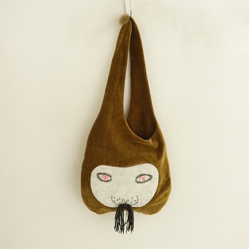 カラーなど:2023年AWコレクション、mina perhonenのusa bag うさバッグです。カラーはキャメルのベルベット生地で、ピンクのボタン・カーキのステッチ・ダークブラウンのレザー調の紐などでうさぎの顔がデザインされており、内側にはベージュ系sleeping roseの裏地&共布の被せとオープンポケットが1つございます。素材は表生地と裏生地が綿100%、別布部分が毛90%,ポリエステル10%で、定価(メーカー希望小売価格)24,200円の商品です。