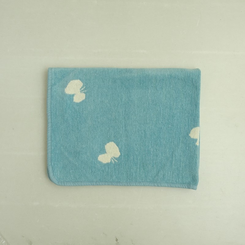 カラーなど:mina perhonen×KLIPPANのchoucho シュニールコットンブランケット ミニです。カラーはライトブルー×オフホワイトで、chouchoのテキスタイルが施されたデザインです。 素材はオーガニックコットン100%のシュニール織で、サイド周りにはぐるりと一周同色のパイピングが施されており、一枚仕立てで裏面は色が反転します。定価(メーカー希望小売価格)13,200円の商品です。