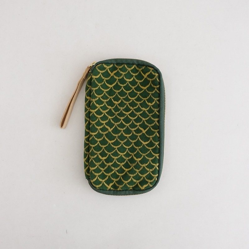 カラーなど:mina perhonen×HOBONICHIのmermaid ちいさいひきだしポーチです。カラーはグリーンベースにマスタードでmermaidのテキスタイル刺しゅうが施されたデザインで、開口部はファスナー開閉、ファスナーの引手にちょうちょのモチーフがあしらわれています。 内側左手にオープンポケット×3、右手にファスナー開閉のメッシュポケットがあり、中にゴムベルト付きです。 外側に1つオープンポケットが付いたデザインです。