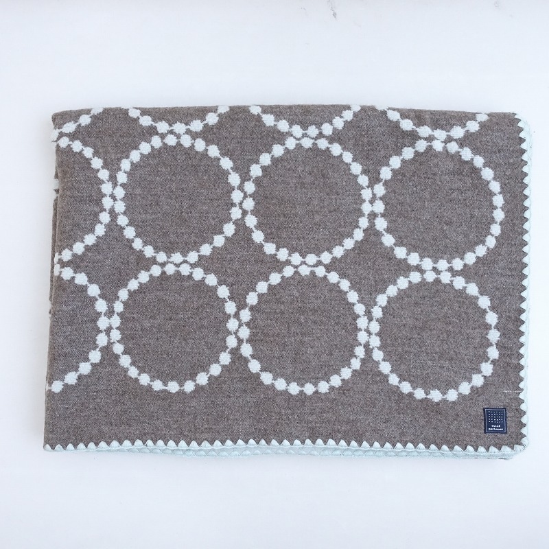カラーなど:mina perhonenのtambourine ウールブランケットです。カラーはブラウン×白に近いライトグレーの総柄で、素材はウール100%、縁周りには淡いミントグリーンステッチが施されています。定価(メーカー希望小売価格)39,600円の商品です。