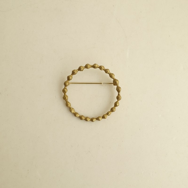 カラーなど:mina perhonenのtambourine ブローチです。カラーはアンティークゴールドで、「tambourine」のテキスタイル刺しゅうがそのままブローチになっております。ぷくっとした刺繍の厚みや糸の細やかな質感までも感じられる、丁寧に作られた存在感のあるお品物です。