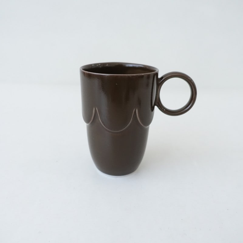 カラーなど:mina perhonenのpudding マグカップです。カラーはブラウンで、釉薬による濃淡の差がございます。スタッキングできるカップは重ねて収納している姿にも愛らしさがあり、やわらかな色合いがどんな食器ともよくなじみ、テーブルにたくさん並んでいる姿はカラフルなスイーツのようにも見えます。