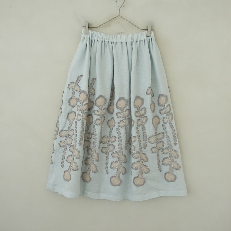 カラーなど:2023年コレクション mina perhonenのfrost garden 刺しゅうスカートです。カラーは淡いブルーベースにグレー・ベージュの刺しゅう入り(ブランド表記カラーはライトブルー)で、透け感ある薄手の麻素材です。ウエスト総ゴム入りで、右腰サイドにシームポケットがあり、裏地付きです。定価(メーカー希望小売価格)79,200円の商品です。